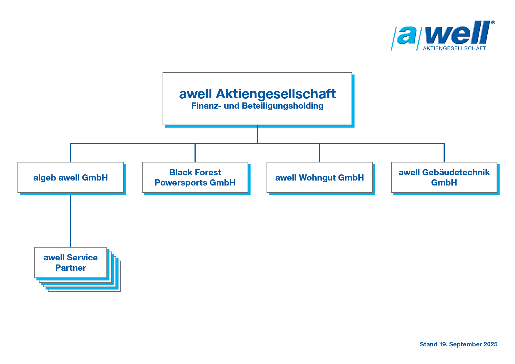 Am 21. Januar 1992 wurde die awell Aktiengesellschaft Finanz- und Beteiligungs-Holding mit einem Stammkapital von 100.000.- DM gegründet und damit die Struktur der awell-Unternehmensgruppe neu festgelegt. Geschäftsführende Beteiligungen bestehen an den Firmen awell Franchise GmbH, awell Digital GmbH und algeb awell AG & Co KG.